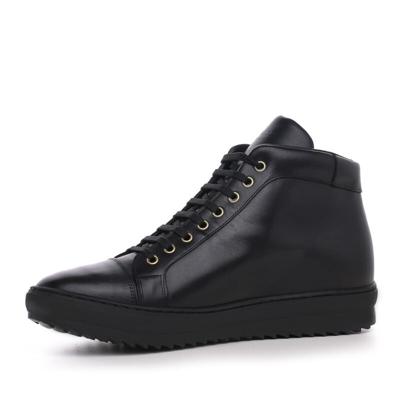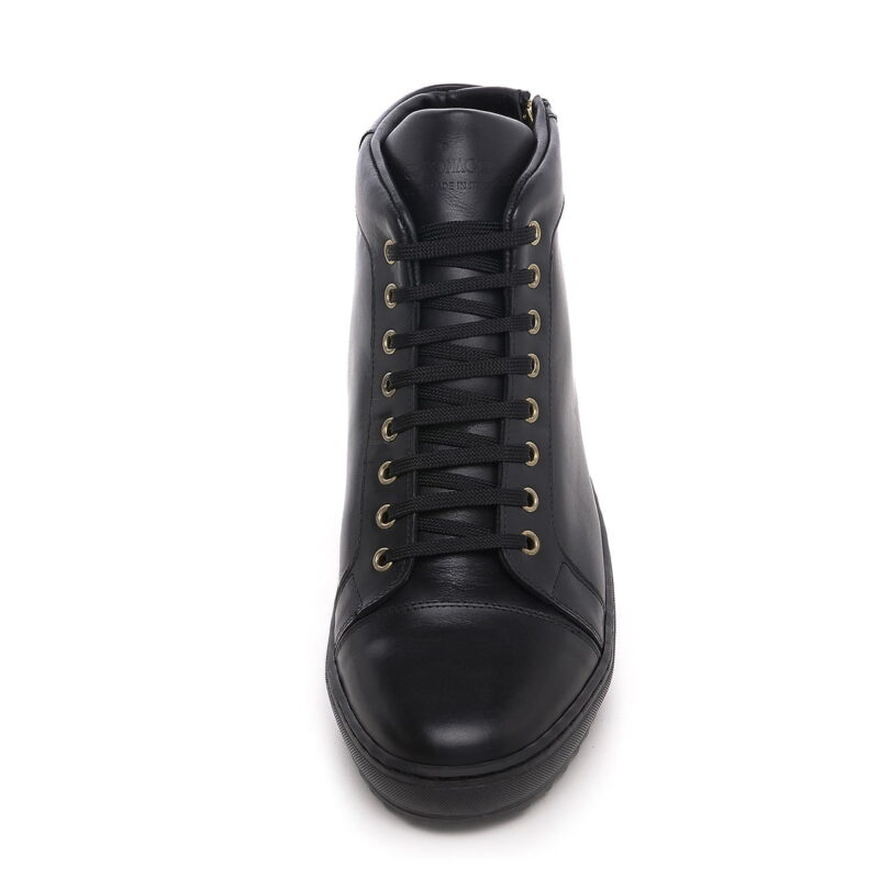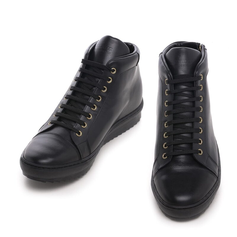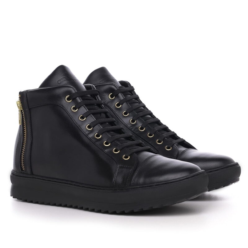 Luxury mid-top elevator sneakers with upper in black full-grain leather and sole in natural rubber. The side zip and the golden eyelets give a trendy touch to match with jeans or slim-fit trousers.